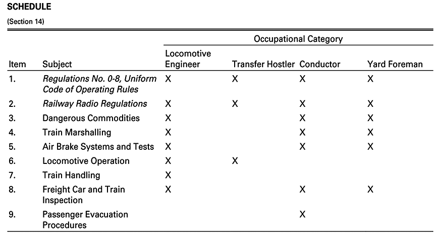 - The subjects required for a person to qualify for an occupational category are the subjects listed in those items of the schedule marked with an "X" under the heading that corresponds to the occupational category, excluding those subjects or portions of subjects dealing with equipment that is not used by the railway company that employs the person.
