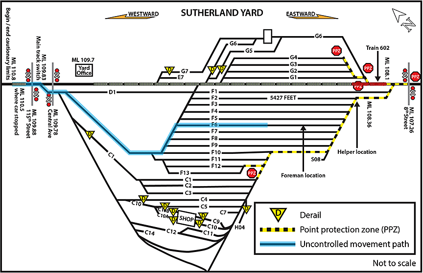 With no derail in place to protect the main track, the car rolled uncontrolled for about 1 mile and traversed 2 public crossings, located at Central Avenue (Mile 109.78) and 115th Street (Mile 109.88), which were both equipped with grade crossing warning systems (GCWS). The car came to a stop at Mile 110.5 on the main track, within cautionary limits.Footnote 4 There were no injuries and no derailment. No dangerous goods were involved.