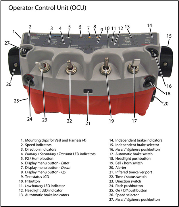Crew members can pass control of the locomotives back and forth between them as required (pitch and catch), but only 1 crew member can have control at a time. The OCU is equipped with (but not limited to) a speed selector, a forward and reverse selector, and a brake selector that includes an emergency brake feature (Figure 6).