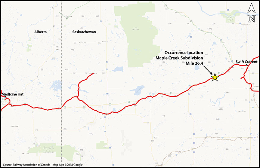 On 03 October 2017, a Canadian Pacific Railway (CP) train crew (the crew) was ordered for 1830Footnote 1 in Swift Current, Saskatchewan (Figure 1). The crew was scheduled to operate freight train 603-230 (the train) westward on the Maple Creek Subdivision from Swift Current (Mile 0.0) to Medicine Hat, Alberta (Mile 147.4). The train departed at about 1905.