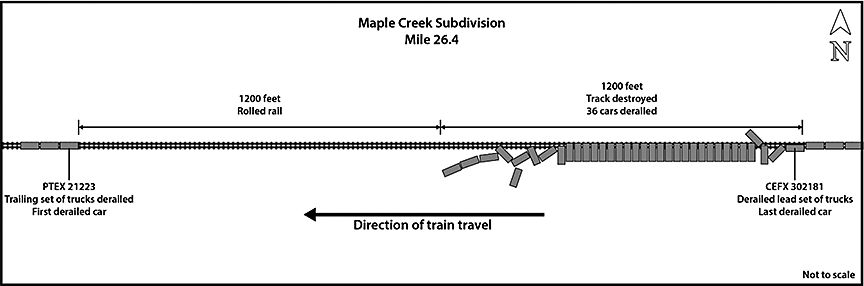 At about 2010, while proceeding at 48 mph, the train experienced a train-initiated emergency brake application at Mile 26.4 of the Maple Creek Subdivision. The lead locomotive came to a stop near the Antelope grain terminal at Mile 28.0. The crew made the required emergency radio call, and then inspected the train. It was determined that 37 cars had derailed: the 107th car to the 142nd car.