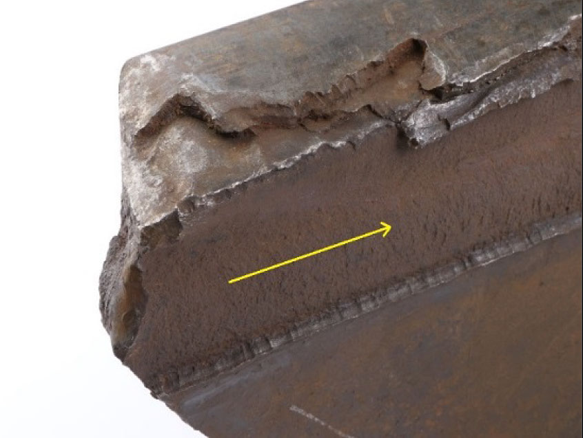 The laboratory examination determined that most of the fractures in the rail were due to overstress as a result of the derailment. However, the gauge side of the rail head was missing on one of the rails. There were indications of a vertical split head (VSH) on this rail. The approximately 2-inch-wide fracture was relatively uniform with a ½-inch band of fatigue cracking along the top edge (zone 1), a ⅛-inch band of fatigue/shear along the bottom edge (zone 3), and an overstress rupture along the 1⅜-inch centre portion (zone 2) (Figure 4). The fatigue cracking along the top of the fracture surface indicated that the overstress portion had been partially separated for an extended period of time. The pre-existing VSH on this rail section had likely progressed to a complete separation during the derailment sequence. Shelling was also present on the running surface at one end of the same rail section (Figure 5), but the VSH fracture passed by the shelling.