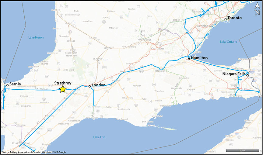 The Strathroy Subdivision consists of a single main track that extends from Mile 0.0 (London, Ontario) to Mile 61.7 (Port Huron, Michigan, United States). Train movements are governed by the centralized traffic control system method of train control, as authorized by the Canadian Rail Operating Rules, and are supervised by a rail traffic controller located in Toronto, Ontario. There are about 14 freight trains and 10 passenger trains daily. Annual tonnage over the subdivision is about 49 million gross tons.