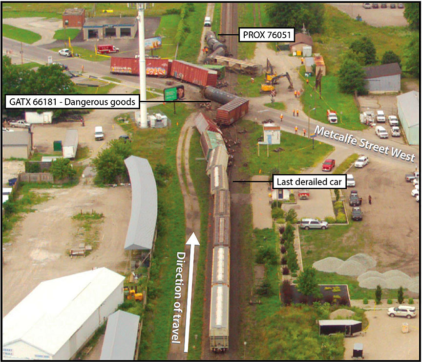 The 110th car (PROX 76051) to the 112th car came to rest south of the main track, 200 to 350 feet west of the Metcalfe Street West crossing. All 3 cars were tank cars that came to rest coupled together, overturned on their sides and parallel to the track. The 113th car came to rest on its side across the track. The 114th car to the 118th car came to rest in various positions, on or adjacent to the crossing, diagonal to the track structure. The 117th car was residue dangerous goods tank car GATX 66181 that had last contained liquefied petroleum gas (UN1075). It came to rest on its side on the Metcalfe Street West crossing. The 119th car to the 121st car were derailed, parallel to the track structure and leaning at an angle of up to 40°. The 122nd car was the last to derail. It remained upright with the A-end truck derailed. There were no injuries, and there was no release of dangerous goods.