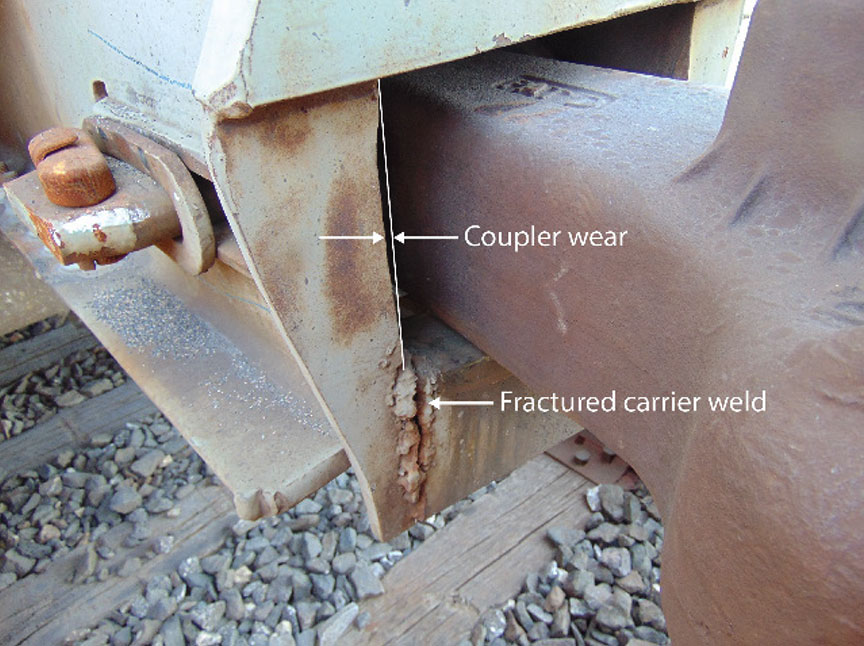 The R-side weld securing the A-end coupler carrier was cracked, which suggests that a higher-than-usual force was applied to the R-side coupler striker plate by the coupler shank. The A-end, R-side vertical coupler striker plate of car NAHX 35909 exhibited wear that permitted the coupler swing angle to increase beyond the established nominal limit of 7° for E60-type couplers.