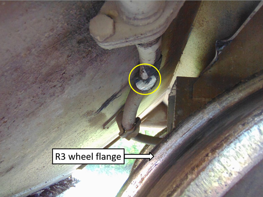 - As the R3 wheel flange of car NAHX 35909 partially burnt/ground through the air brake pipe, the pipe diameter was reduced and contact with the wheel flange partially sealed the air brake pipe such that air was released at a rate that was insufficient to trigger a train-initiated emergency brake application.