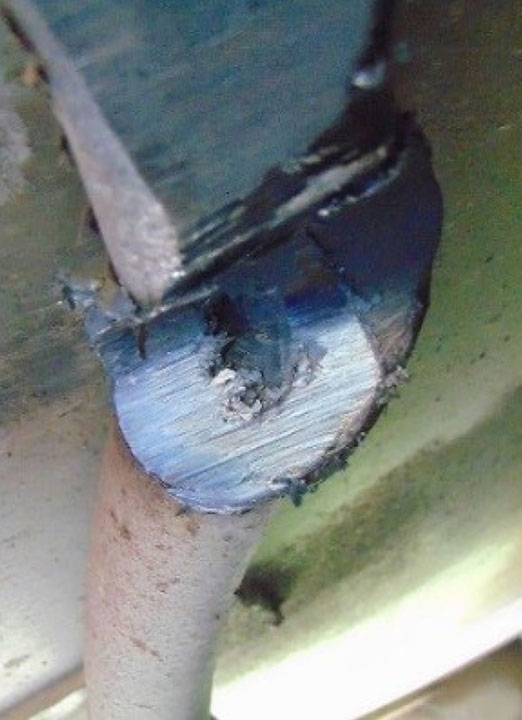 In addition, wheel flange friction burn/grind marks were observed on the air brake pipe near the R3Footnote 5 wheel. The air brake pipe was partially severed, allowing air to escape. The cut ends displayed signs of heat damage, and the melted metal reduced the diameter of the air brake pipe (Figure 4 and Figure 5).