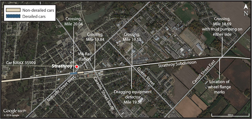 - Upon reaching the VIA Rail Canada Inc. platform, the trailing B end of car NAHX 35909 separated from car PROX 76051, and the 13 cars behind car NAHX 35909 derailed and then came to rest in the vicinity of the Metcalfe Street West crossing (Mile 20.04), in downtown Strathroy, Ontario.