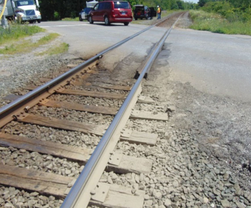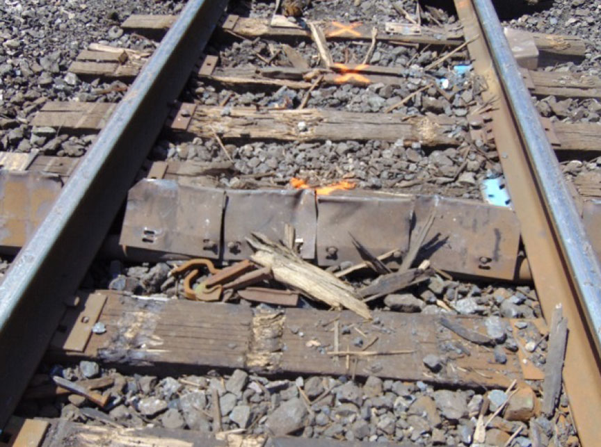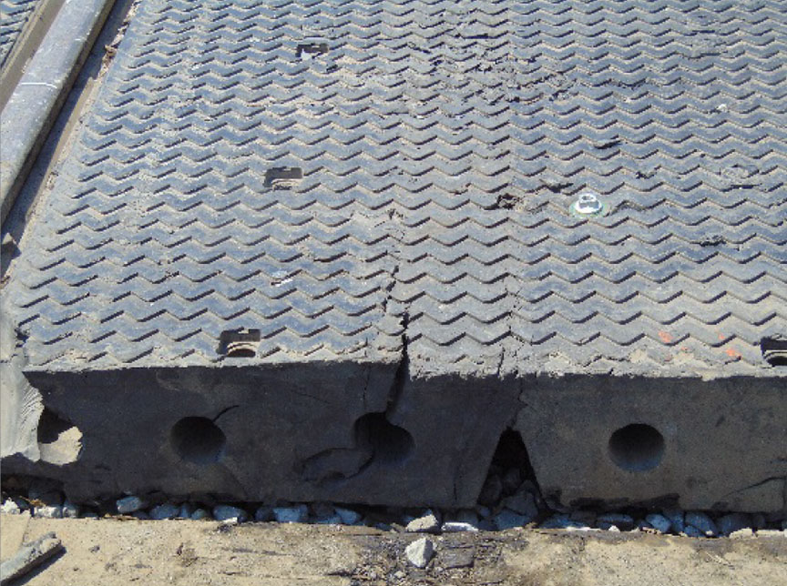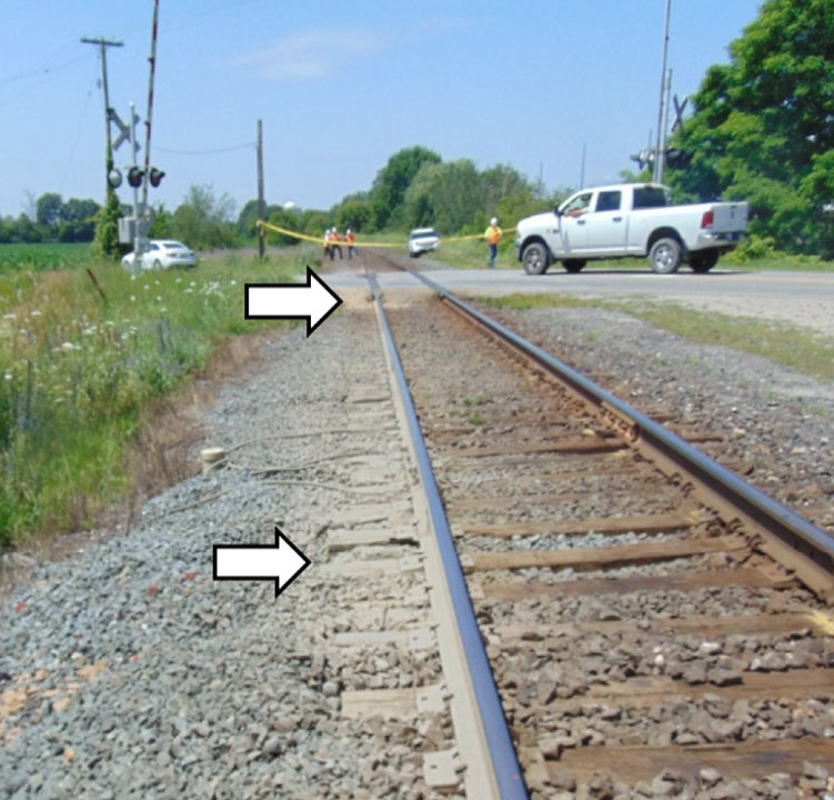 Slightly further west, the Queen Street crossing (Mile 19.50) displayed wheel impact marks on its rubber surface (Figure 9). A DED, located immediately west of the crossing (Mile 19.51), showed 3 sets of wheel impact marks on its deflection paddles (Figure 10). These marks continued on the ballast and track structure between the rails for about one third of a mile further westward to the Caradoc Street South crossing (Mile 19.84). At the Caradoc Street South crossing, the east end of the concrete surface displayed wheel flange marks about 6 inches north of the north rail that continued through to the west end of the crossing surface where they re-aligned back onto the rail.