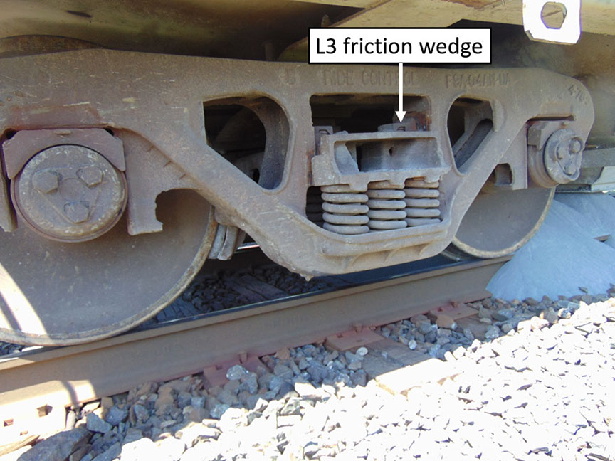During the post-occurrence teardown of the A-end truck of car NAHX 35909, the recorded L3 friction wedge rise was 113/16 inches, which was the limit outlined in Rule 46 of the AAR Interchange Rules. Furthermore, track/train dynamics analysis concluded that the L3 friction wedge rise was the most influential condition in this occurrence because it reduced the truck squaring and damping forces, and contributed to the elevated L/V ratio.