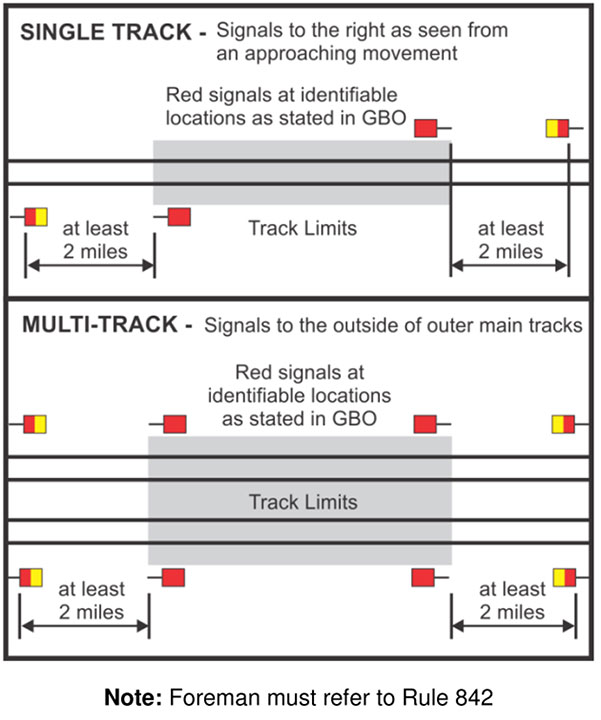 In Figure A1, above, for single track, red signals are depicted at the locations stated in the GBO, and yellow-over-red flags are placed at least 2 miles in advance of the red flags. The flags are placed to the right of the track as seen by approaching movements. For multi-track, red signals are depicted at the location stated in the GBO, and yellow-over-red flags are placed at least 2 miles in advance of the red flags. The flags are placed outside of outer main tracks.