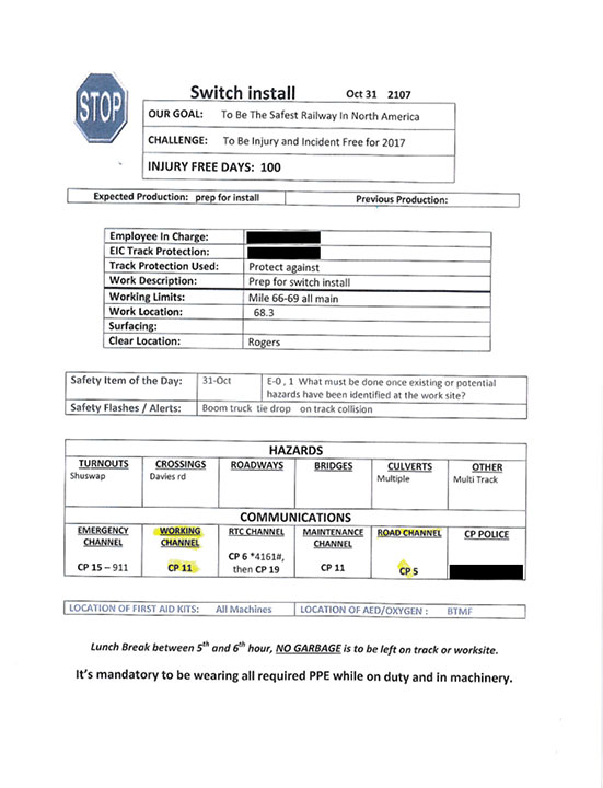 The foreman told all sub-foremen and contract workers under his protection and the supervisor that an eastbound train would require the Connaught track for passage in about an hour. Contrary to the Canadian Pacific Railway (CP) Engineering On-Track Safety/Task Assessment Booklet, no formal job briefing was conducted to inform all employees and contractors of the change in track routing for trains. At that time, the eastbound train had not yet arrived, nor had its crew requested permission to pass through the work limits.