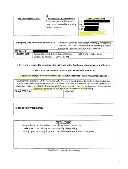 | 0001 | At Revelstoke, the supervisor completed and printed the on-track safety job briefing form. |