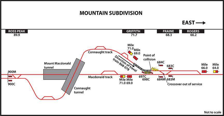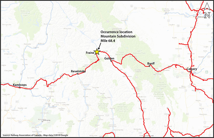 The Mountain Subdivision extends westward from Field, BC (Mile 0.0), to Revelstoke, BC (Mile 125.7). In the vicinity of the occurrence, the track consisted of double main tracks descending toward the east at about 1%. There was a 1° right-hand curve in the direction of travel. Given the ascending grade to the west on the Connaught track, westbound trains are typically operated on the Macdonald track and eastbound trains are typically operated on the Connaught track.