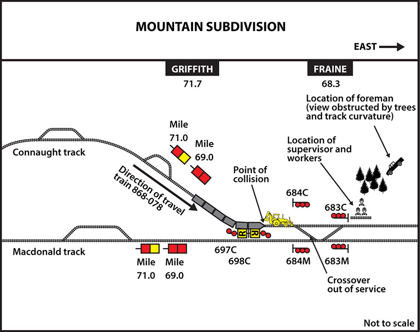 | 0440 | The foreman told some of the workers (including the supervisor) that eastbound train 868-078 was lined toward the work limits on the Connaught track. |