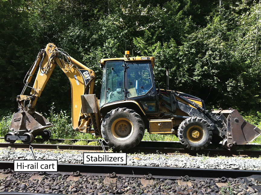 Working under the direction of the supervisor, the backhoe operator was performing clean-up duties along and between the tracks about 1000 feet west of the crossovers. The backhoe was attached to a hi-rail–equipped cart to facilitate movement of the machine on the track (Figure 4).