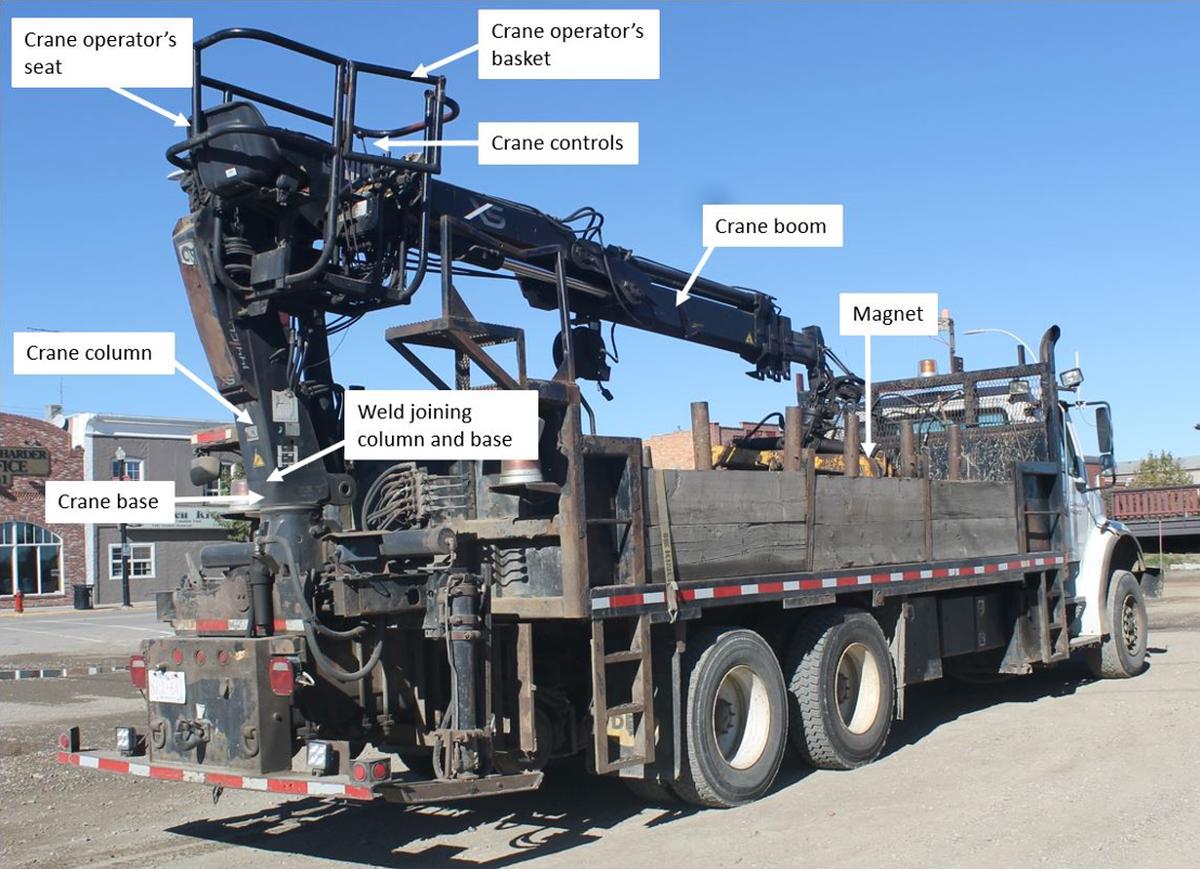 The accident occurred during a routine Engineering Services work crew task involving the unloading of tie plates from a material-handling truck, using a boom crane. The material properties of the steel and the weld joining the crane column to the base of the crane met the manufacturer's specifications. The analysis will focus on the failure of the crane column; the damage sustained by the truck/crane due to a rear-end collision with a train; inspection and maintenance of operator's seatbelt, seat securement, and basket; and non-destructive testing (NDT).