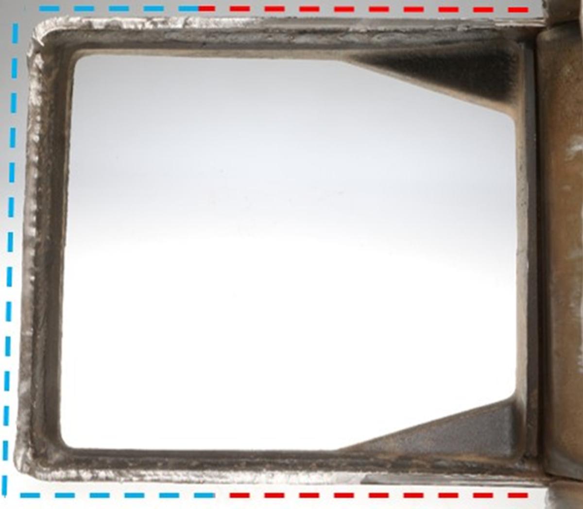 Visual examination of the failed crane column revealed that the failure occurred in the welded region that joined the column and the crane base. The fracture originated in the heat‑affected zone at the toe of the weld, on the interior of the column. The fracture surface had two distinct regions with different appearances. One region was flat and perpendicular to the axis of the column, and the other region had a 45-degree slanted surface (Figure 5).