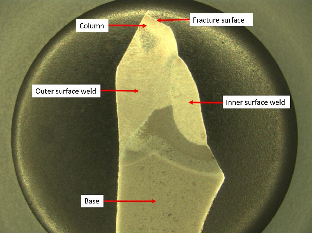 Metallurgical examination of the weld cross-section determined that there were 2 welds: 1 weld on the inner column surface and 1 weld on the outer surface (Figure 8). Both welds were homogeneous and had good penetration. The different microstructures of the column and base parent metals, the weld bead, and the heat-affected zones were typical for this type of welding.