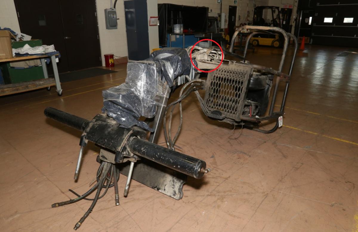 The examination also found that the buckle portion of the operator's seatbelt was missing, the locking mechanism of the operator's seat was missing several parts, and a support piece of the frame on the underside of the bottom of the operator's basket was broken.