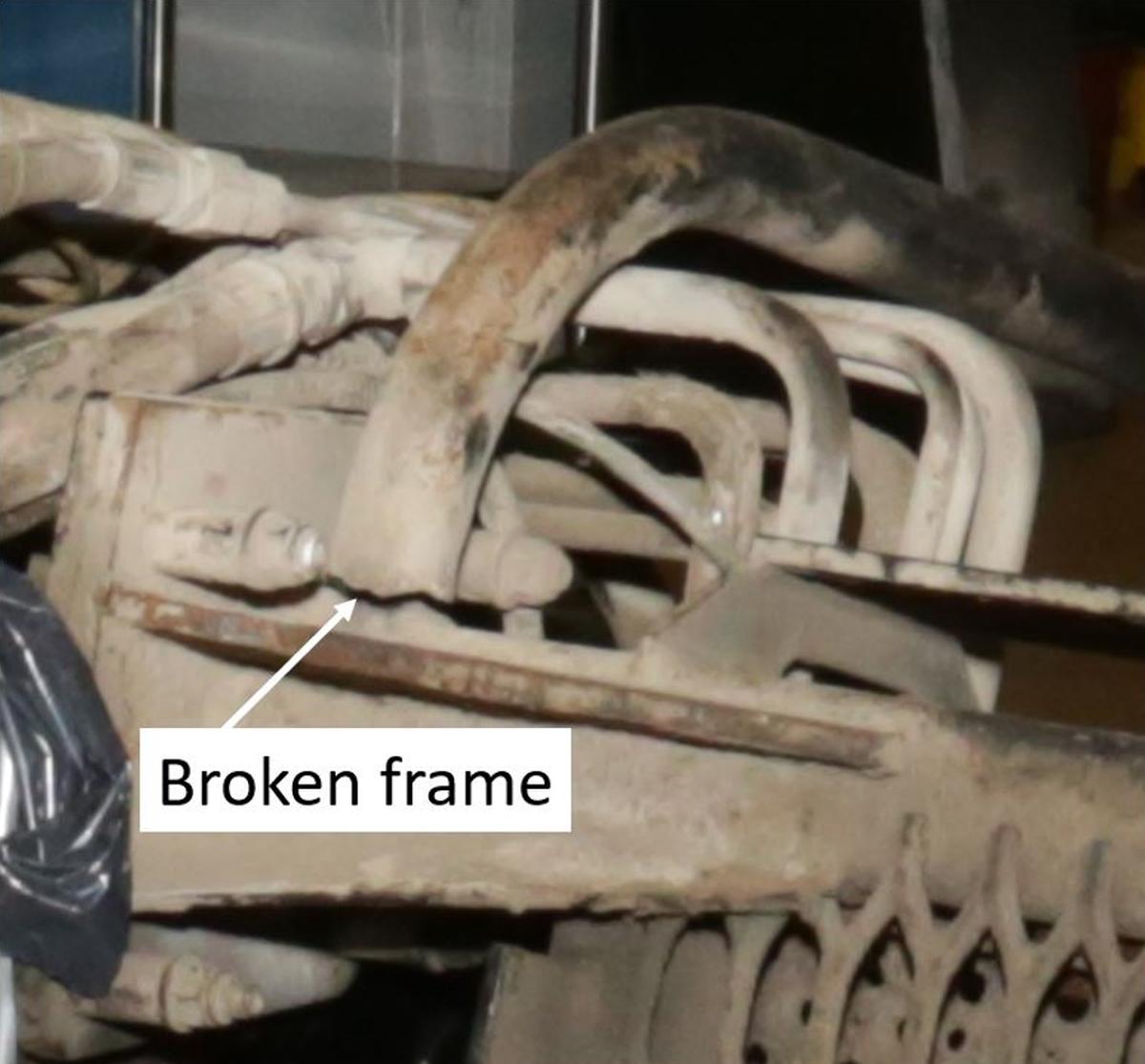 A support piece of the frame on the underside of the bottom of the operator's basket was broken, corroded, and covered in dirt (Figure 10 and Figure 11).