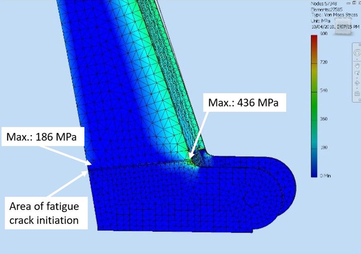 - Without the existing fatigue crack, with the boom raised at or above 60 degrees, the stress would have increased by about 64%. The highest stress recorded was 436 megapascals (MPa), which was located at the corner of the front and side walls of the column. This area of highest stress is not in the area where the initial cracking was observed in the failed crane column (Figure 12).