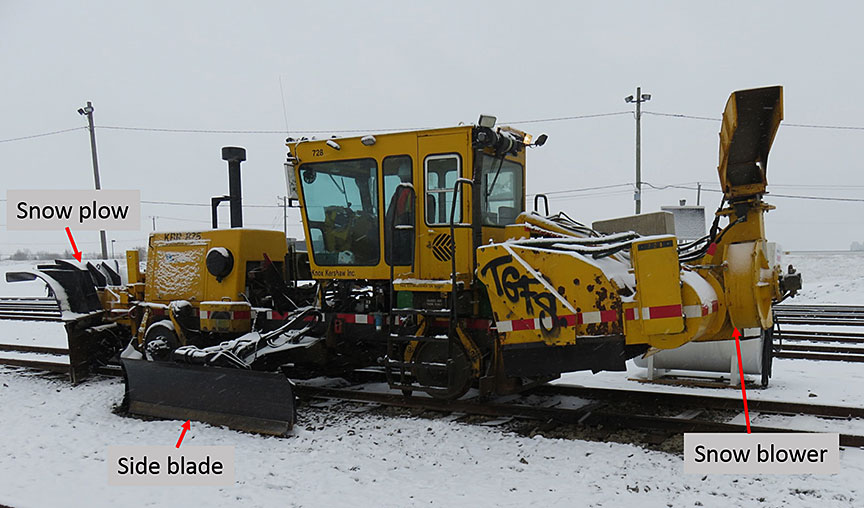 In this occurrence, because of the size of the side blades mounted on the TU, the operator was to ensure that the blades were lifted and locked when the TU was approaching passenger platforms at train stations or any other obstacle. To do so, the operator would slow down and use the control handle attached to the seat. When the TU was travelling east, the snow plow was facing forward and the operator was facing in the direction of the movement. When the TU was travelling west, the operator's view was partially obstructed by the snow blower.