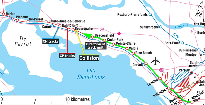 After completing snow removal at Montréal-West, the TU had to get off the tracks to clear the way for the rush-hour commuter trains on the Vaudreuil-Hudson line of the Réseau de transport métropolitain. Unable to obtain permission from the rail traffic controller (RTC) to occupy the adjacent tracks while the TU changed direction,Footnote 2 the TU operator had to go back to Dorion, on the south track and in reverse, with the snow blower facing the direction of travel. At 1418, a track occupancy permit was issued to travel between Beaconsfield and Dorion.