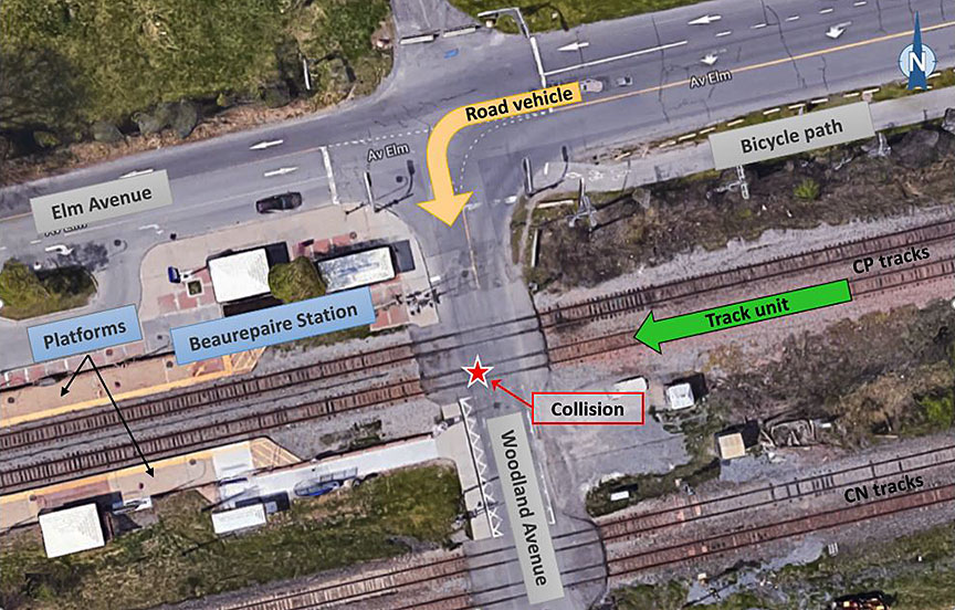 The collision occurred at a public crossing equipped with a warning system (bell, flashing lights, and gates) that was not activated by the TU.Footnote 3 The crossing traverses 4 tangent railway tracksFootnote 4 at a 90° angle in an urban neighbourhood. Elm Avenue is located to the north of the CP right-of-way and runs parallel to the tracks. A bicycle path, trees, and utility poles are located along the south side of Elm Avenue. The Beaurepaire commuter train station is located directly to the west of the crossing. There are passenger platforms on both sides of the CP tracks (Figure 3). The crossing gives road vehicles travelling on Elm Avenue access to Highway 20 and the southern part of the city of Beaconsfield.