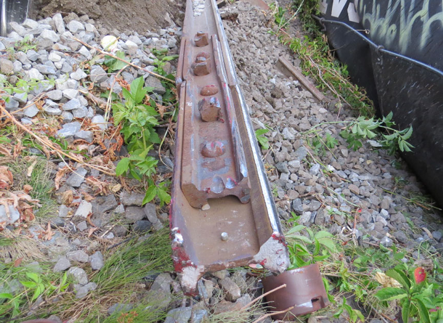 - The east rail had partially rolled over and ruptured at Mile 35.83, a few inches before a compromised splice bar (Figure 3). The rail was of the head-free rail type.Footnote 5