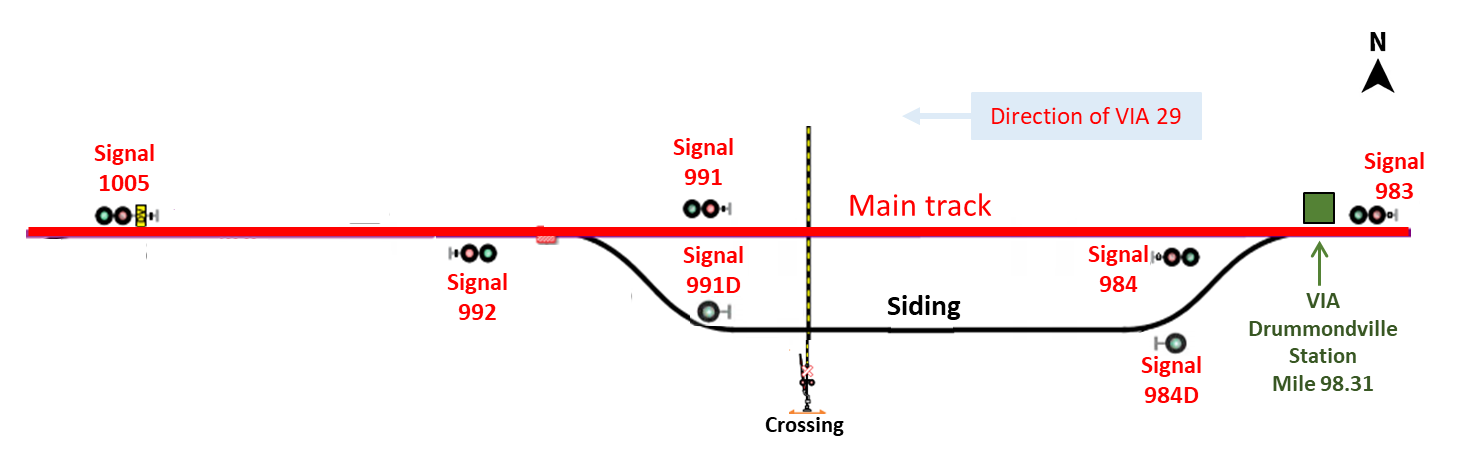 CN’s Drummondville Subdivision is a single main track with several sidings where trains can meet and pass each other. In accordance with VIA’s schedule, the 2 trains typically met at Drummondville.Footnote 2 At about 1926, in anticipation of the meet, the CN rail traffic controller (RTC), located in Montréal, lined the Drummondville west siding switch for VIA 28 to enter the siding and routed both trains beyond Drummondville by requesting follow-up Signal 984D for VIA 28 and follow-up signals 991, 1005 and 1027 for VIA 29. VIA 29 was to proceed on the main track at Drummondville.