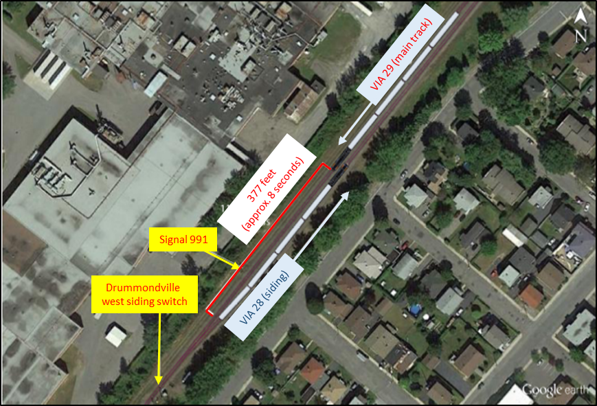 VIA 29 ran through the Drummondville west siding switch and continued westward toward Montréal. VIA 29’s crew members were unaware that they had passed a Stop indication or that VIA 28 had only just cleared the main track. There were no injuries.