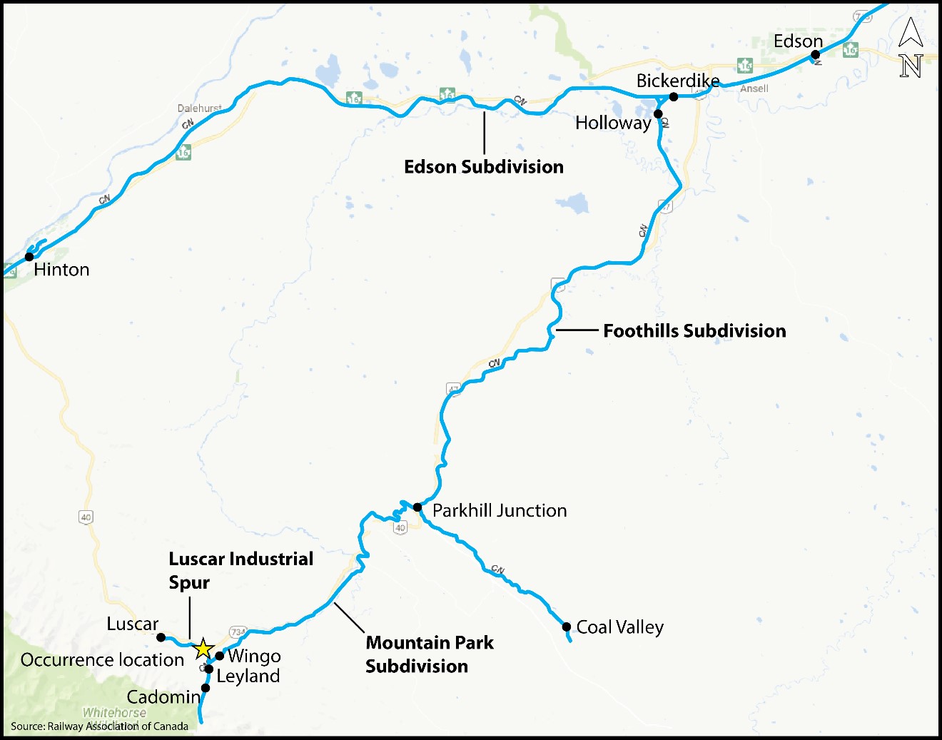 On 09 January 2018, a Canadian National Railway Company (CN) train crew was called at 1203Footnote 2 and came on duty at 1400 in Edson, Alberta. They planned to operate unitFootnote 3 coal train C76850-09 westward from Holloway, Alberta, on the Foothills Subdivision to the Mountain Park Subdivision, and hence to the Luscar Mine (at the Cardinal River Operations owned by Teck Resources Limited) at Mile 5.5 on the Luscar Industrial Spur. The Luscar Industrial Spur extends northward for 5.8 miles from Mile 22.4 on the Mountain Park Subdivision (Figure 1).