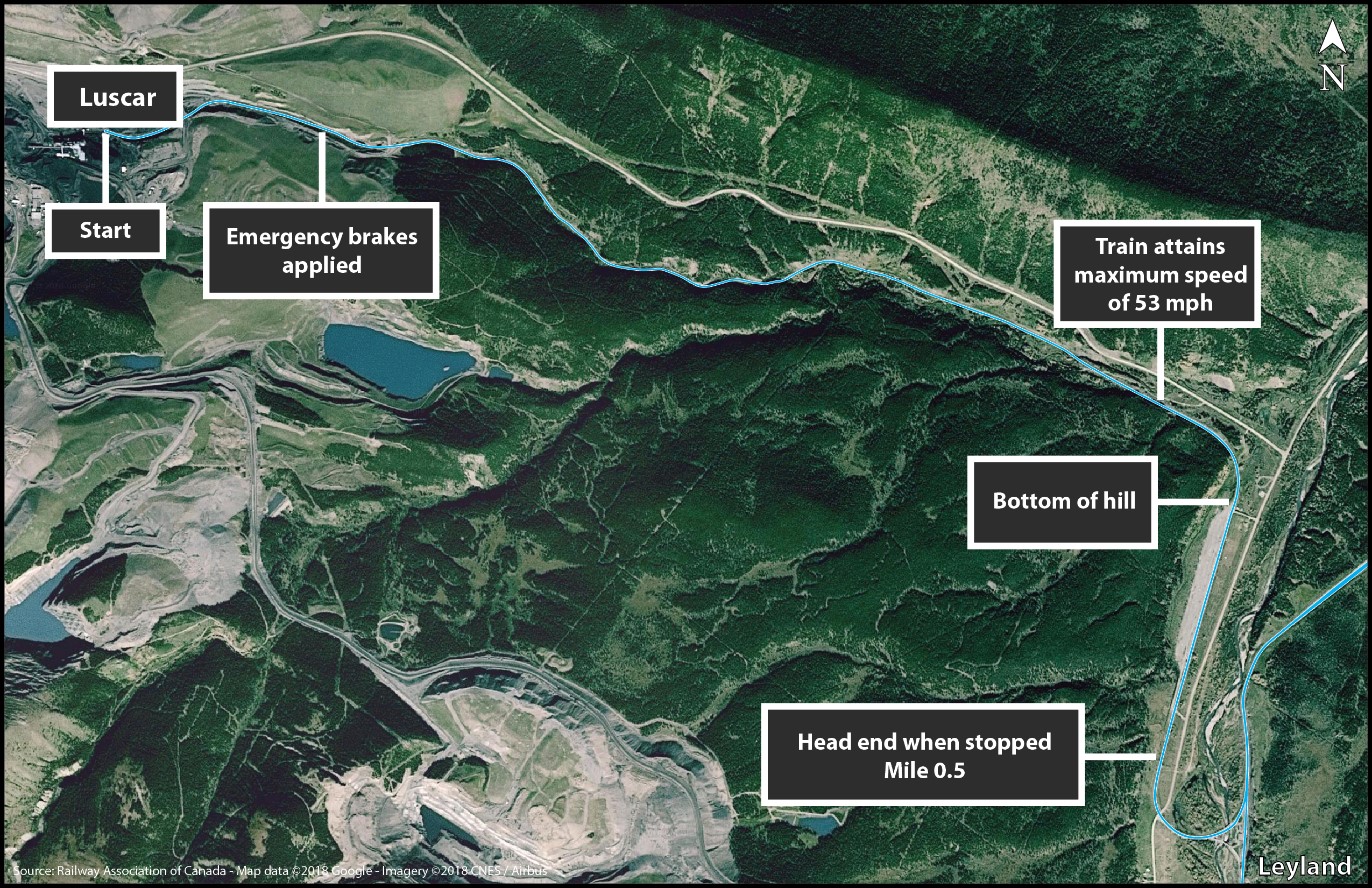 On 10 January 2018, at approximately 0228 Mountain Standard Time, Canadian National Railway Company freight train L76951-10, proceeding southward on the Luscar Industrial Spur from the Teck Resources Limited Cardinal River Operations coal loading facility near Cadomin, Alberta, experienced a loss of control while proceeding down the mountain grade to Leyland, Alberta. The train reached a maximum speed of 53 mph before it came to a stop at Mile 0.5. There were no injuries.