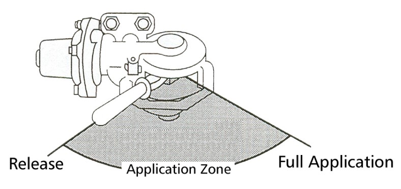 When a normal automatic brake application is required, the locomotive engineer (LE) moves the automatic brake valve handle (Figure A3) to the desired position. This action removes air from the brake pipe at a service rate. As each car control valve senses a sufficient reduction in pressure, air flows from the auxiliary reservoir located on each car into that car’s brake cylinder, applying the brake shoes to the wheels.