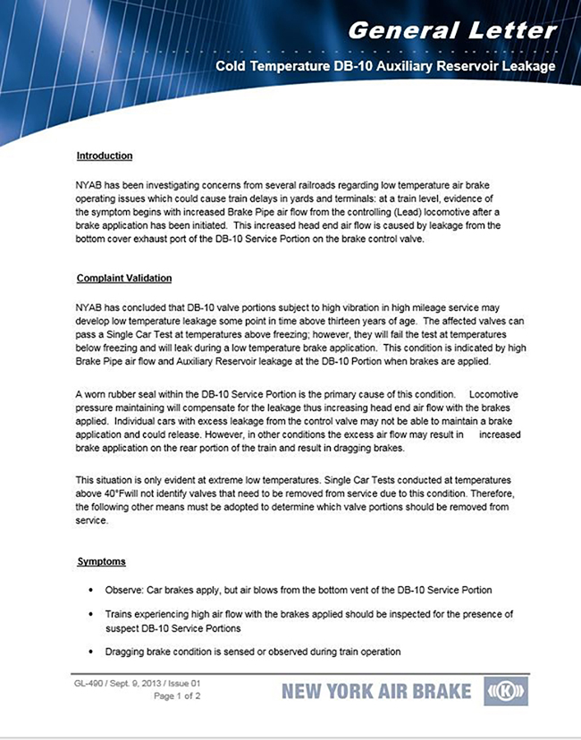 - The DB-10 service portion failures reported by Canadian National Railway Company (CN) were determined to be the same as the balancing valve issue that was evaluated in 2013 and covered under Association of American Railroads (AAR) Circular Letter C-12027 and NYAB General Letter GL-490 (Appendix C).