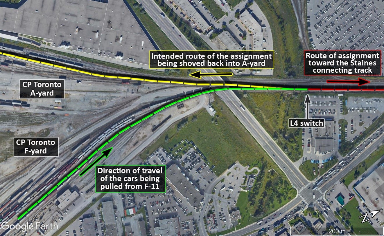 The plan had been for the assignment to pull 88 cars, weighing 6400 tons and measuring 6250 feet in length, from track F-11 eastward on the Staines connecting track. This move required the assignment to proceed past the Tapscott Road public crossing and to continue until the last car was past the L4 switch. The assignment was then to be reversed back into the A-yard (Figure S1).