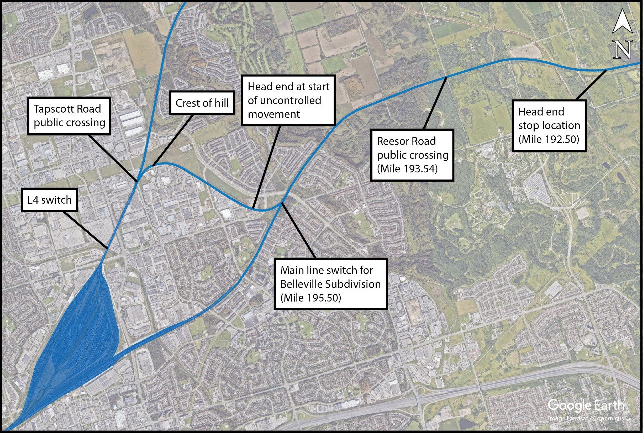 Toronto Yard is located in the Agincourt/Scarborough suburb in the Greater Toronto Area. Movements within the yard are conducted under Canadian Rail Operating Rules (CROR) Rule 105, Operation on non-main track.Footnote 6 According to this rule, movements are restricted to speeds of up to 15 mph and must be able to stop within half the range of vision of equipment.