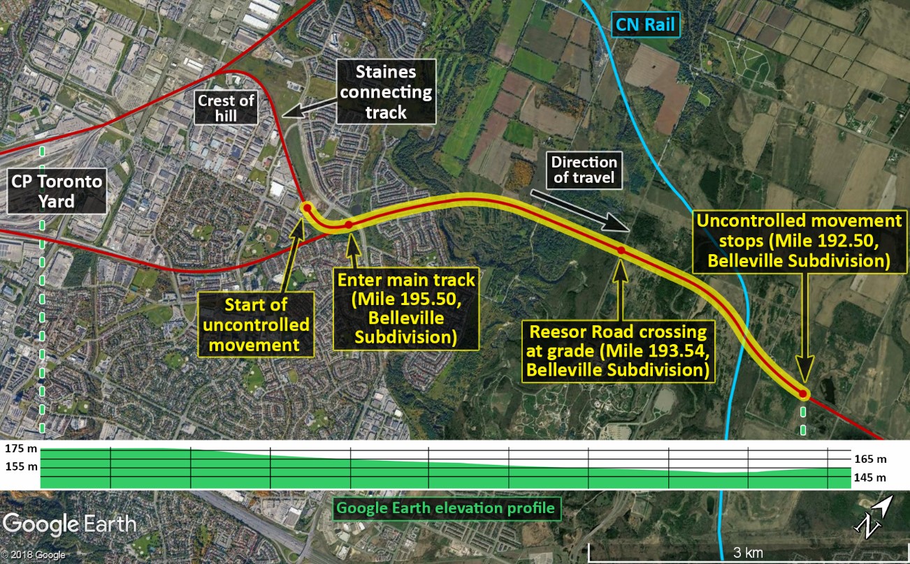 On 14 April 2018, at about 0215 Eastern Daylight Time, a Canadian Pacific Railway (CP) yard foreman and a CP yard helper were performing switching operations at CP’s Toronto Yard in Toronto, Ontario using a remote control locomotive system (RCLS). The yard foreman was operating yard assignment T16-13 (the assignment) when it began to roll uncontrolled eastward on the Staines connecting track.