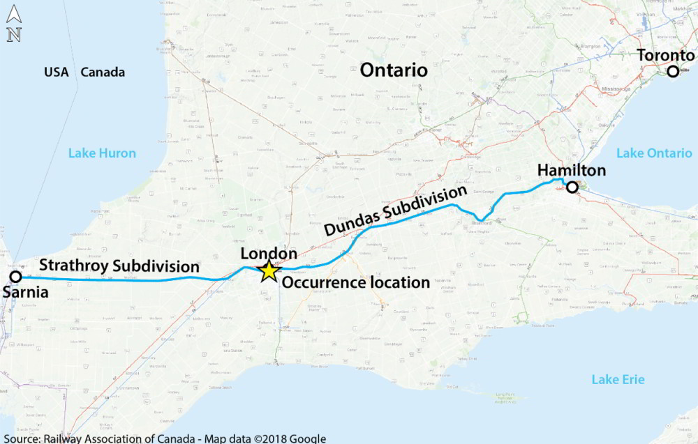 On 08 January 2018, at about 1900,Footnote 1 Canadian National Railway Company (CN) freight train Q14891‑08 (the train) departed Chicago, Illinois, U.S., destined for Montréal, Quebec (Figure 1). The train entered Canada at Sarnia, Ontario (Mile 57.2 of the Strathroy Subdivision), and travelled eastward to London, Ontario, where the Strathroy Subdivision joins the Dundas Subdivision. The train continued eastward on the south main track of the Dundas Subdivision.