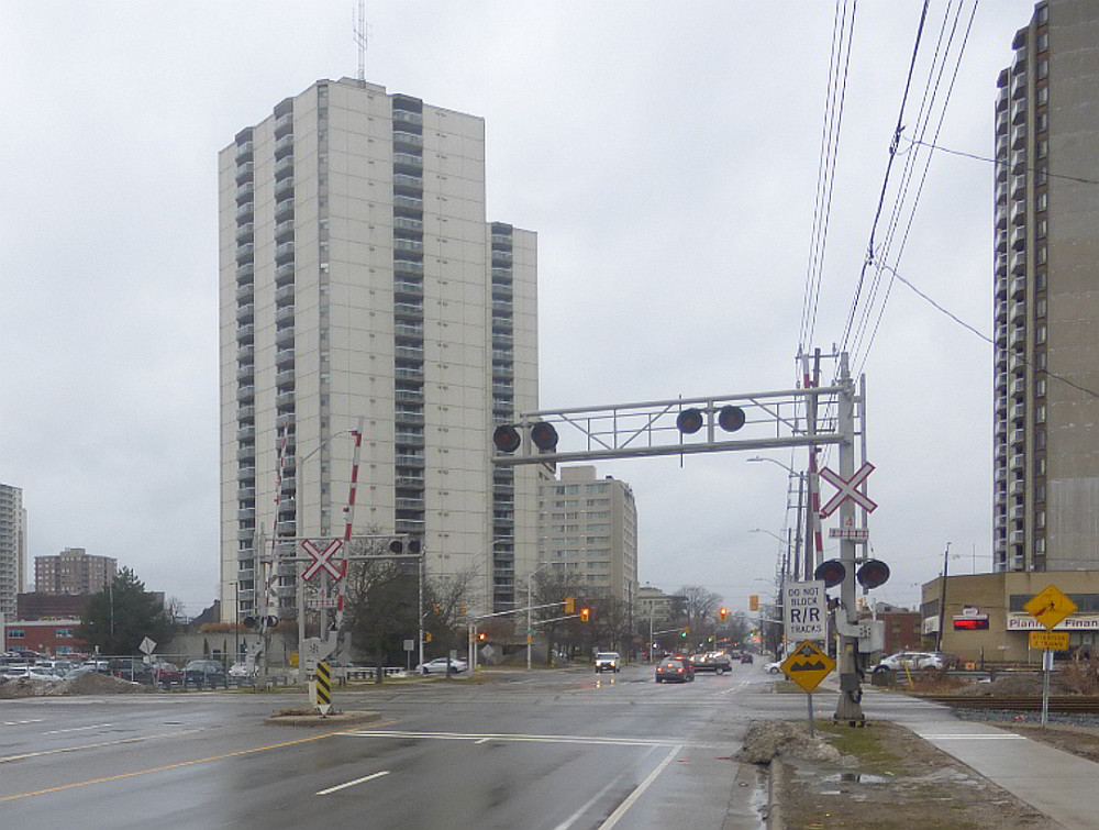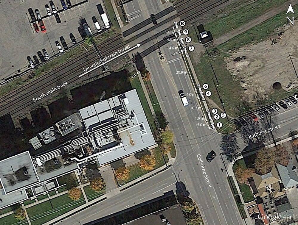 At the Colborne Street public crossing, road traffic on both the north approach and the south approach is protected with flashing light signals (some on cantilevered structures), a bell, standard reflectorized crossing signs, and gates (Figure 3). The gate at the north approach is installed at the roadside and extends across 2 lanes of traffic. The south approach has 2 gates, with 1 gate installed on the boulevard in the middle of the roadway extending across 1 lane of traffic, and 1 gate installed at the roadside extending across the other lane of traffic.