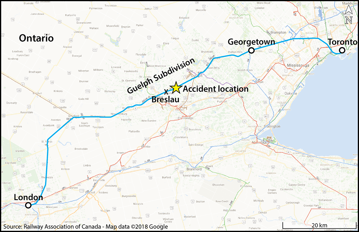 The Guelph Subdivision consists of a single main track that extends from Silver (Mile 30.0), near Georgetown, Ontario, to London, Ontario (Mile 119.1). Train movements on the subdivision are controlled by the centralized traffic control system (CTC), as authorized by the CROR and are supervised by a RailTerm rail traffic controller (RTC) located in Dorval, Quebec, as contracted by the Goderich-Exeter Railway. An average of 14 trains per day operate on the Guelph Subdivision: 8 Metrolinx trains, 4 VIA trains, and 2 Goderich-Exeter Railway freight trains.