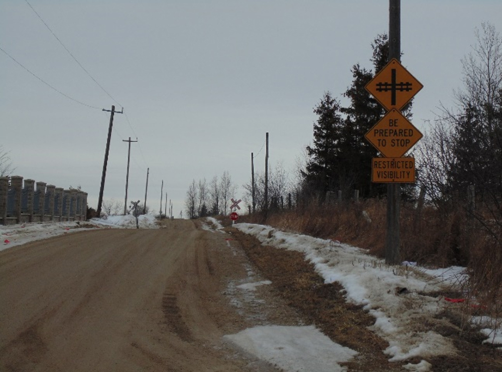 Advance warning signs are present along the road about 100 m in advance of the crossing in both directions. The advance warning signs inform vehicle drivers that visibility is restricted and to be prepared to stop at the crossing (Figure 2 and Figure 3).