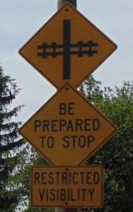 Standard railway crossing signs are yield signs that identify locations where drivers must yield the right-of-way to a train. When approaching a railway level grade crossing, drivers should slow their vehicle and be prepared to stop. If a stop sign is posted at the crossing, all vehicles must stop, and proceed onto the crossing only when it is safe to do so.