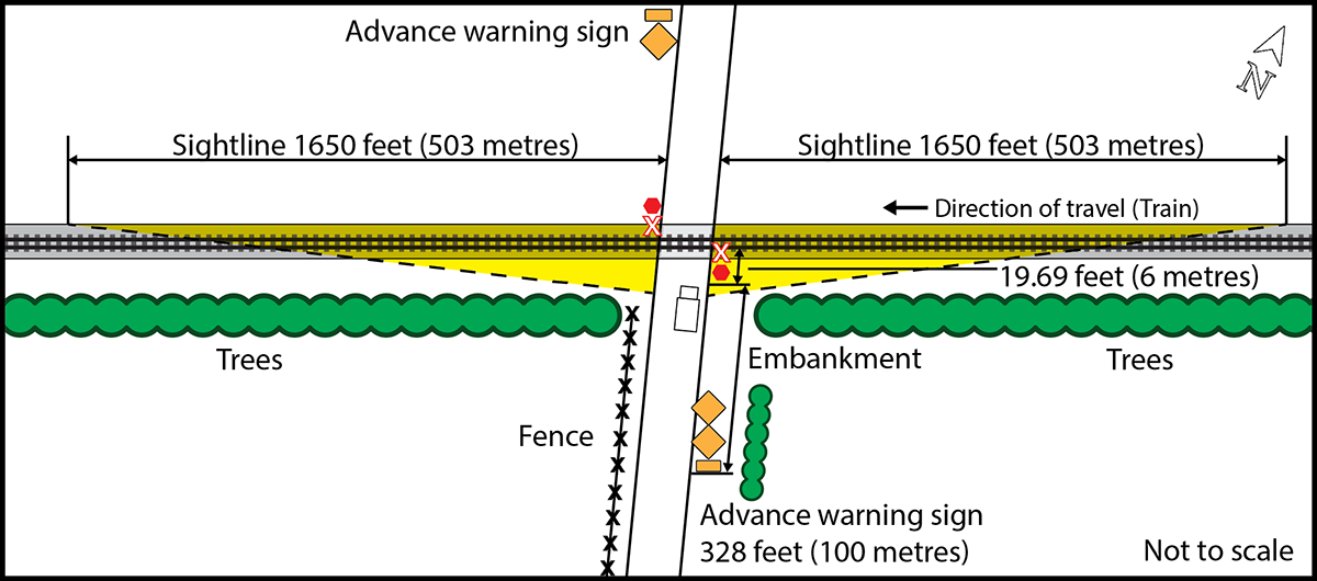 The sightlines at a crossing must allow users to have sufficient time to see an approaching train and to react to it. For crossings equipped with a stop sign, sightlines are measured from the seated driver's position with the vehicle stopped at the stop sign, not less than 5 m from the nearest rail.