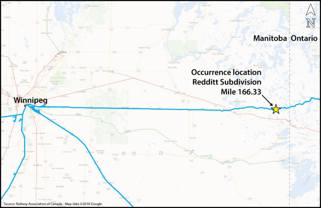 On 05 January 2018, at about 1925 Eastern Standard Time,Footnote 1 the train departed Sioux Lookout, Ontario, on CN’s Redditt Subdivision. The train was composed of 2 head-end locomotives, 21 loaded cars, 32 empty cars, and 11 residue tank cars. The train weighed about 4343 tons and was approximately 4334 feet long. The crew consisted of a locomotive engineer and a conductor. Both crew members were qualified for their respective positions, were familiar with the territory, and met established fitness and rest standards.