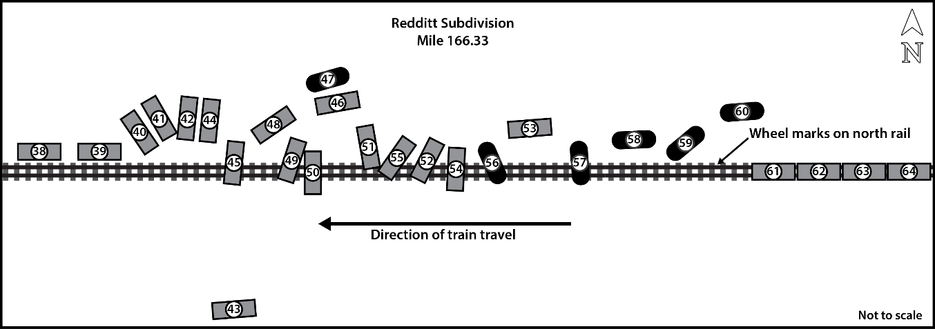 A subsequent inspection determined that 23 cars, the 38th to the 60th from the head-end, had derailed at Mile 166.33.
