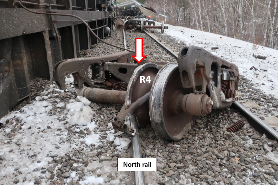 The 38th car (car ATW 400515), the first derailed car, had come to rest at Mile 166.48. The car’s trucks were on the track next to the ends of the car. The R4 wheel from the leading A-end truck of the car had broken, come off its axle wheel seat, and moved inboard along the axle body before coming to rest against the L4 (mate) wheel (Figure 4).