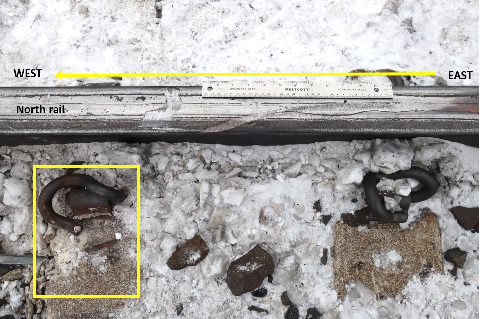At the east end of the derailment site, a wheel mark was observed on the running surface of the north rail at Mile 166.33, starting in the middle of the running surface and extending westward for about 9 inches toward the gauge side of the rail. A small piece of wheel tread was observed between the rails adjacent to the wheel mark. Immediately west of the wheel mark, there was damage to the track fastener (gauge side) and to the concrete tie (Figure 5).
