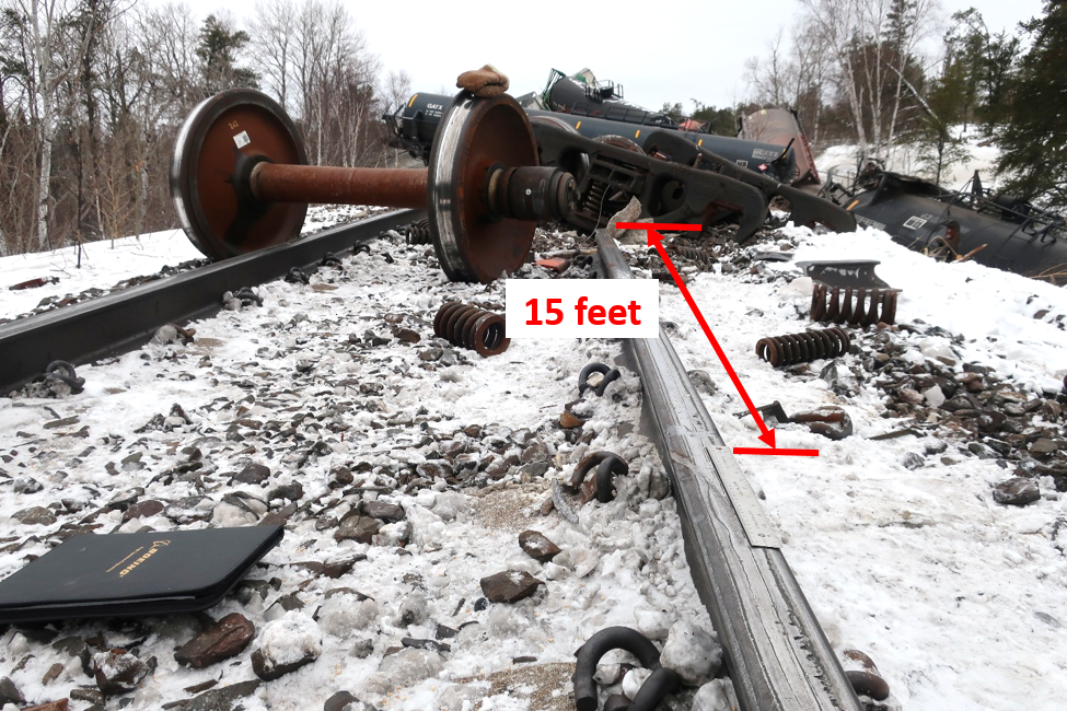 The wheel travelled on the ground for about 800 feet until additional pieces of the wheel rim/tread separated from the wheel; as a result, car ATW 400515 came to a stop at Mile 166.48 and the trailing 22 cars derailed. The source of the VSR defect could not be determined owing to the mechanical damage to the wheel during the derailment. The fracture likely originated in a 6-inch section of wheel rim/tread, which was never found.